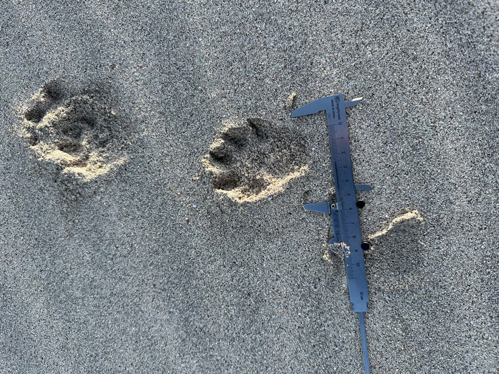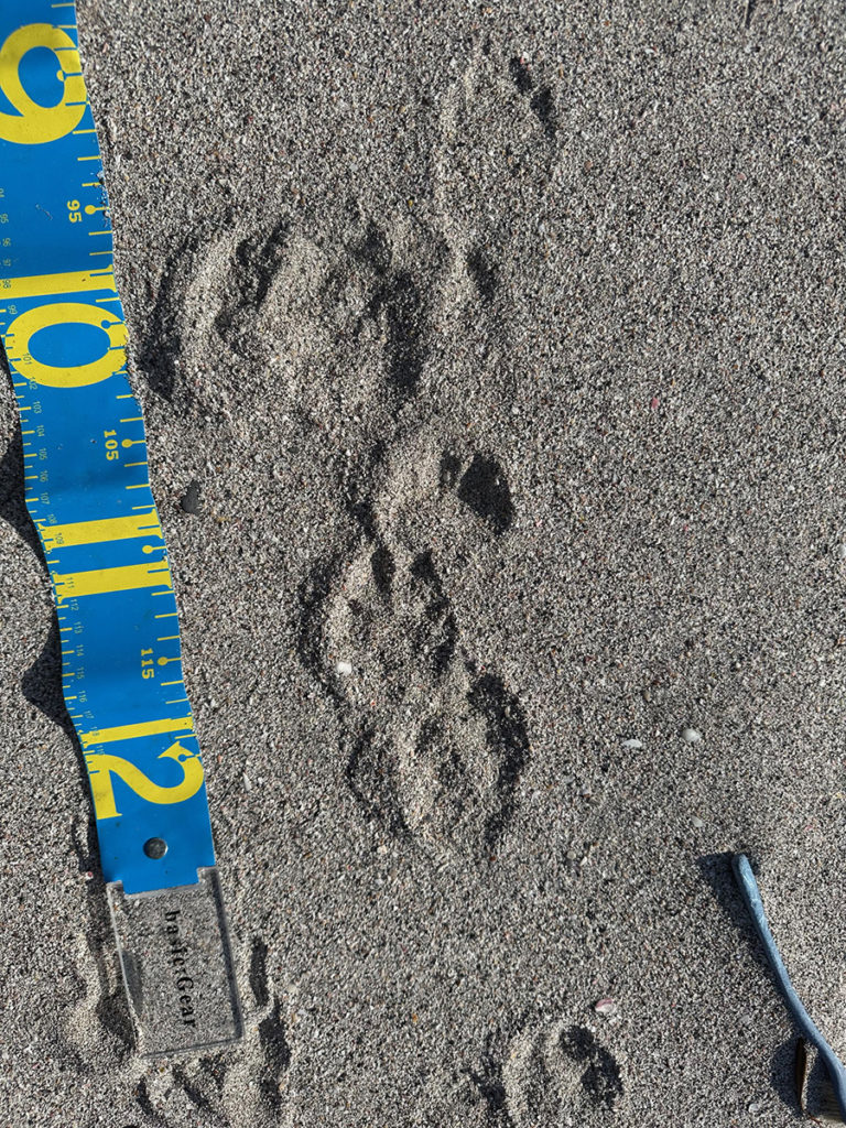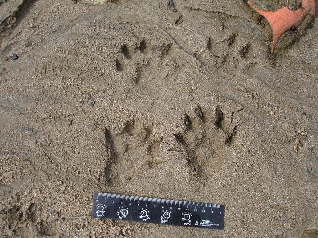 テン、この黒島にいるのは天然記念物の「ツシマテン」ですが体長60㎝前後、体重1.5㎏程の対馬だけに生息するイタチ科の動物です。足跡は前後とも5本指で横幅は60㎝未満、爪痕はしっかり残ります。