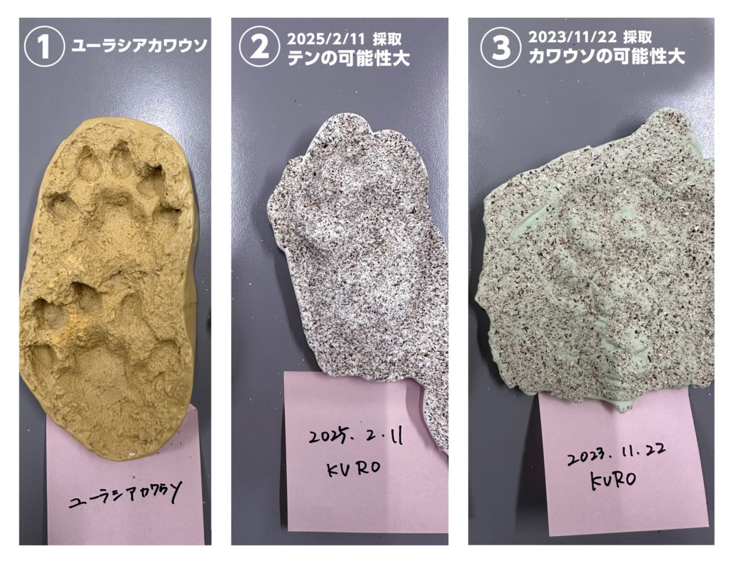 以上のことから今年2月に調査採取した足跡はすべてがテンの足跡であり、2023年11月の調査採取した足跡はカワウソの可能性が高いことが判明しました。