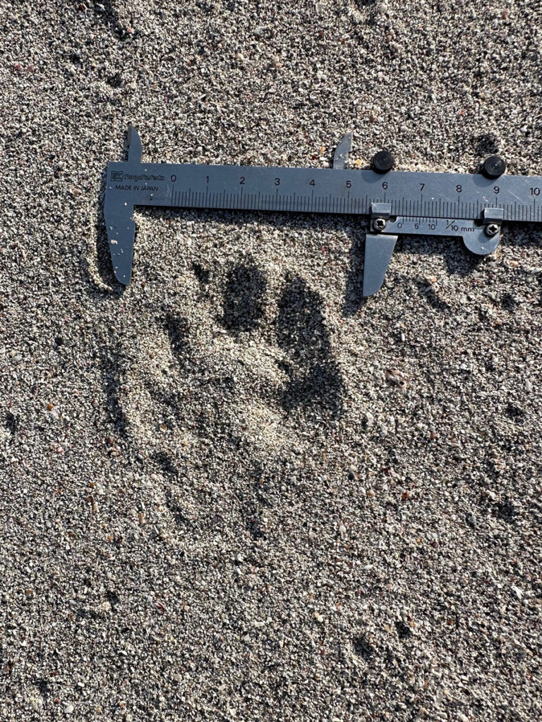 次に2023年11月の調査で採取した足跡を検証します。この足跡も横長は63㎜ですが、指球が大きく付きあまり爪痕は深く付いていません。掌球も大きく付いており今回のテンの足跡よりもユーラシアカワウソに近いと思われます。