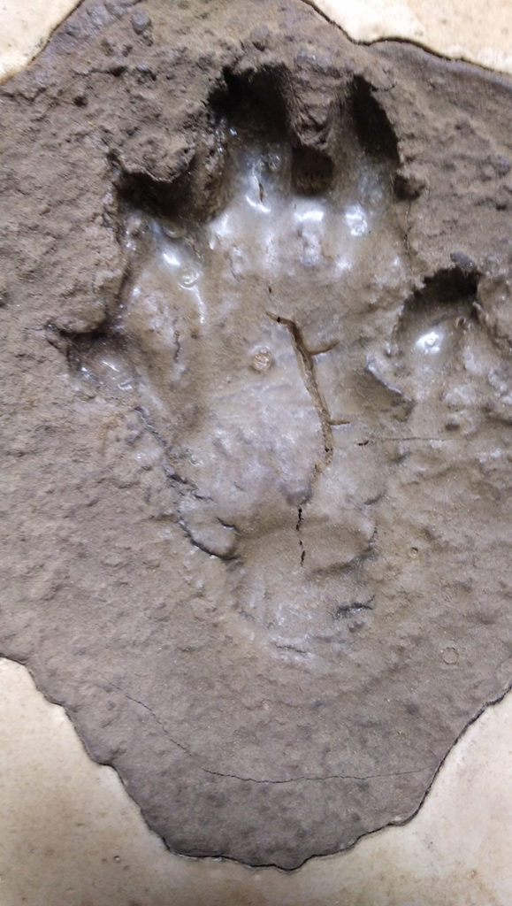 これは韓国で採取したユーラシアカワウソの右前脚の凹型です。指球が5つと真ん中に大きな掌球と指根球が付き、爪跡は大きくなく指との間に足ひれが見られます。そして第1指から第2指が内側に向いています。